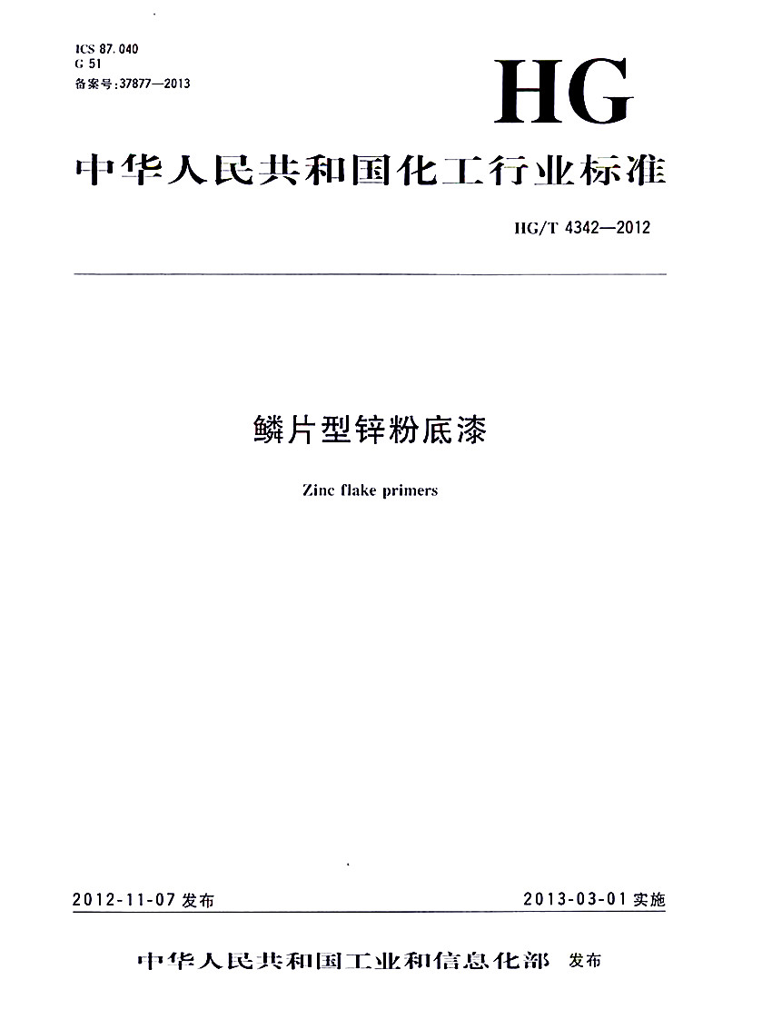 HG/T 4342-2012鱗片型鋅粉底漆標準 ICS87.040 G51 備案號:37877-2013 HG 中華人民共和國化工行業標準 HG/T 4342-2012 鱗片型鋅粉底漆Zinc flake primers 2012-11-07發布 2013-03-01實施 中華人民共和國工業和信息化部 發布 本標準規定了鱗片型鋅粉底漆的產品分類、要求、試驗方法、檢驗規則、標志、包裝和貯存等內容。本