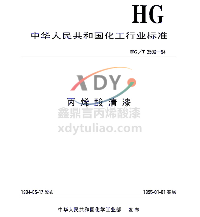 式中:K—酸價,mg KOH/g; N—氫氧化鉀-乙醇溶液濃度,mol/L; V—滴定氫氧化鉀-乙醇溶液的體積,mL; G—試樣重量,g。 兩次平行試驗結果之差與平均值之比不得大于3%。 5.6、干燥時間 5.6.1、表干 按GB/T6753.2的規定進行。 5.6.2、實干 按GB/T1728中甲法的規定進行。 5.7、漆膜顏色及外觀 按GB/T9761的規定進行。 5.8、硬度 按GB/T1730中科尼格擺的規定進行。 5.9、漆膜彎曲 試板為馬口鐵板(50mm×120mm×0.2-0.3mm)3塊,按4.4制備樣板。在GB9278規定的條件下干燥24h后,按GB/T6742的規定進行。 5.10、劃格試驗 試板為馬口鐵板(50mm×120mm×0.2-0.3mm)3塊,按4.4制備樣板。按GB/T9286的規定進行,切割數為6,切割間隔1mm。 5.11、耐汽油性 試板為LY12鋁板(50mm×120mm×1-2mm)4塊,3塊投入試驗,1塊作標準板。 按GB/T1727中的噴涂法制備漆膜,在GB9728規定的環境條件下干燥24h后,將樣板的2/3浸入到GB1787RH-75號航空汽油中,按規定時間取出,10min后,按GB/T9274中5.4的規定檢查漆膜。 5.12、耐水性 試板為LY12鋁板(50mm×120mm×1-2mm)4塊,3塊投入試驗,1塊作標準板。 按GB/T1727中的噴涂法制備漆膜,在GB9278規定的環境條件下干燥24h后,用1:1的石蠟和松香混合物包封樣板的背面與周邊,待其冷卻后,浸入GB/T6682的三級水中。按規定時間取出,按GB/T9274中5.4的規定檢查漆膜。 5.13、耐熱性 試板為LY12鋁板(50mm×120mm×1-2mm)4塊,按4.4制備樣板,3塊投入試驗,1塊作標準板。 按GB/T1735的規定進行。 6、檢驗規則 6.1、本標準中所列的全部技術指標項目均為型式檢驗項目,其中除耐熱性一年抽檢一次外,其余均為出廠檢驗項目,每批必檢。 6.2、產品由生產廠的檢驗部門按本標準規定進行檢驗,生產廠應保證所有出廠產品均符合本標準的技術指標,產品應有合格證,必要時另付使用說明及注意事項。 6.3、接收部門有權按本標準的規定對產品進行檢驗,如發現產品質量不符合本標準技術指標規定時,供需雙方共同按GB3186重新取樣進行復驗,仍不符合本標準技術指標規定時,產品即為不合格,接收部門有權退貨。 6.4、產品按GB3186進行取樣,樣品應分兩份,一份密封貯存備查,另一份作檢驗樣樣品。 6.5、供需雙方應對產品包裝及數量進行檢查核對,如發現有損漏,數量由出入等現象時,應及時通知有關部門。 6.6、供需雙方在產品質量上發生爭議時,由產品質量監督檢驗機構進行仲裁檢驗。 7、標志、包裝、運輸和貯存 7.1、標志 按GB/T9750的規定進行。 7.2、包裝 產品應裝于清潔、干燥、密封、內無機械雜質的容器中。 7.3、運輸 產品在運輸時應防止雨淋、日光曝曬、避免碰撞并應符合交通運輸部門的有關規定。 7.4、貯存 產品應存放在陰涼通風、干燥、防止日光直接照射并隔絕火源,遠離熱源的庫房內。夏季氣溫過高時,應設法降溫。 7.5、產品在符合7.2和7.3的規定條件下,自生產完成日算起,有效貯存期為一年,超過貯存期可按本標準規定的項目進行檢驗,如果符合技術要求,仍可使用。 丙烯酸清漆簡介: