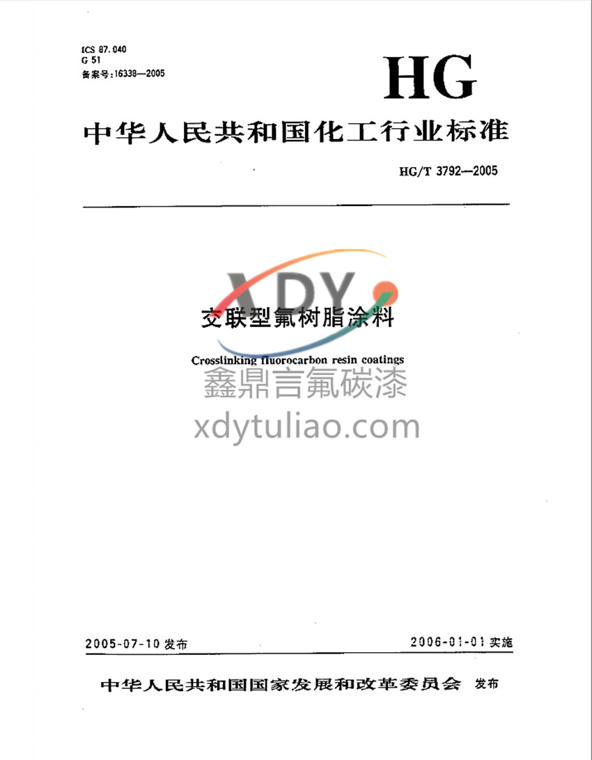 交聯(lián)型氟樹脂涂料化工行業(yè)標(biāo)準(zhǔn)HG/T 3792-2005:中華人民共和國(guó)化工行業(yè)標(biāo)準(zhǔn) 2005-07-10發(fā)布 2006-01-01實(shí)施 中華人民共和國(guó)國(guó)家發(fā)展和改革委員會(huì)發(fā)布 本標(biāo)準(zhǔn)適用于以含反應(yīng)性官能團(tuán)的氟樹脂為主要成膜物并加入顏填料(清漆不加)、溶劑、助劑等輔料作為主劑、以脂肪族多異氰酸酯樹脂為固化劑的雙組份常溫固化型建筑外墻用面漆和金屬表面用面漆。本標(biāo)準(zhǔn)還適用于以含反應(yīng)性官能團(tuán)的氟樹