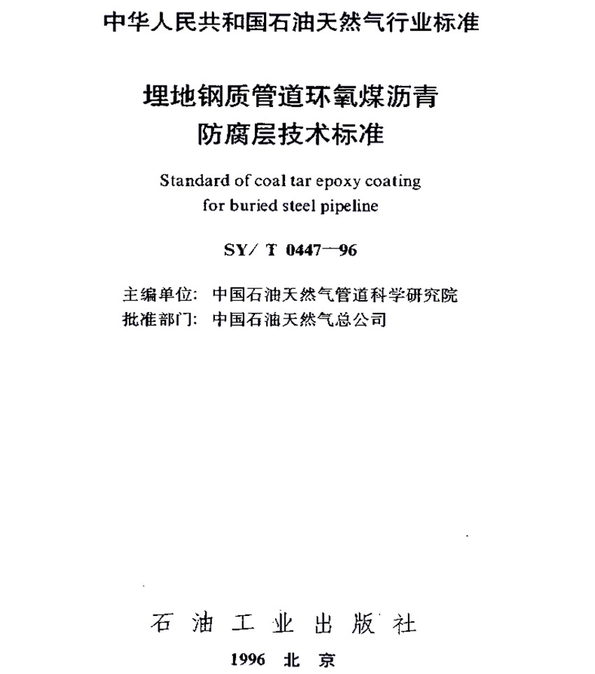 SY/T 0447-96埋地鋼質管道環氧煤瀝青防腐層施工技術要求標準是防腐涂料小編復制SY/T 0447-96《埋地鋼質管道環氧煤瀝青防腐層技術》電子版,可以放心參考。更多防腐涂料防腐涂裝執行的國家標準和行業標準,可以查閱本防腐涂料網站。